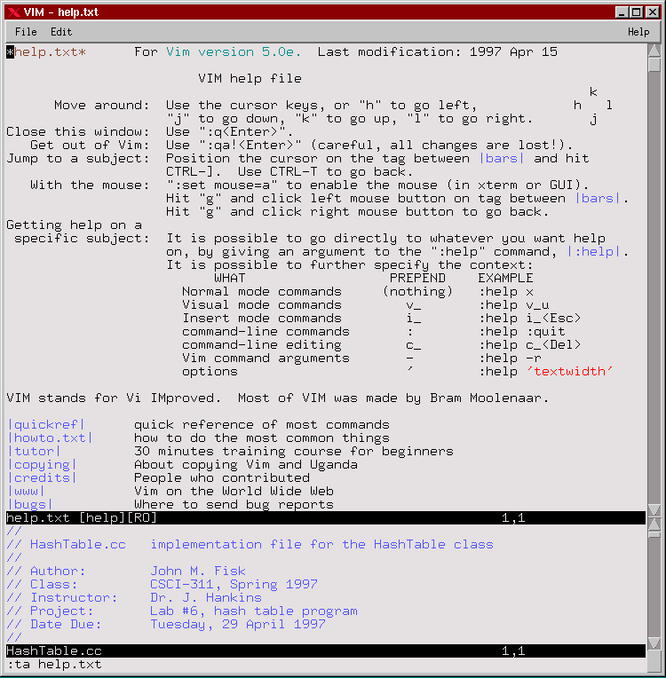 What I was going to say was that vim also provides syntax highlighting for shell scripts (VERY COOL!), makefiles, and the VIM help files (which you'll see here in just a bit). All in all, this is pretty nice. I've been tinkering around with this a bit and am really starting to like it. Be aware that the highlighting isn't quite as "intelligent" as with something like XEmacs -- it doesn't provide the same degree of sophistication. Still, it's very good and, being an order of magnitude smaller and a good deal more nimble, it's well worth trying.