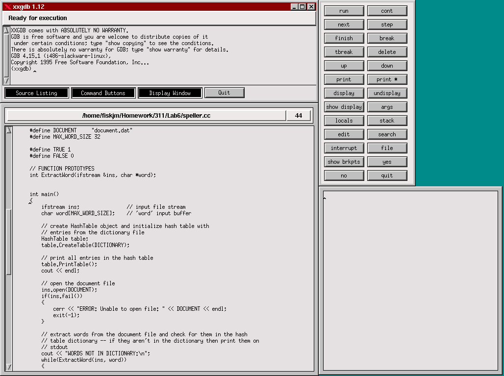 I've not had a chance to use the new DDD debugger as much as xxgdb, but what I've tried I'm been VERY impressed with. You'll see from the screen shots above that it has a much improved GUI as compared to xxgdb. Also, a number of new features have been added since the previous 1.4 release. One feature that I really like is setting a breakpoint, running the program, and then, by positioning the mouse pointer over a variable or data structure, getting a pop up balloon with the current value of that data structure.