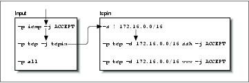 Our example creates user-defined chains for each of the ssh and www services in each connection direction. The chain called wwwout is where we place rules for hosts that are allowed to make outgoing World Wide Web connections, and sshin is where we define rules for hosts to which we want to allow incoming ssh connections. We've assumed that we have a requirement to allow and deny individual hosts on our network the ability to make or receive ssh and www connections. The simplication occurs because the user-defined chains allow us to neatly group the rules for the host incoming and outgoing permissions rather than muddling them all together. The improvement in efficiency occurs because for any particular datagram, we have reduced the average number of tests required before a target is found. The efficiency gain increases as we add more hosts. If we hadn't used user-defined chains, we'd potentially have to search the whole list of rules to determine what action to take with each and every datagram received. Even if we assume that each of the rules in our list matches an equal proportion of the total number of datagrams processed, we'd still be searching half the list on average. User-defined chains allow us to avoid testing large numbers of rules if the datagram being tested doesn't match the simple rule in the built-in chain that jumps to them.