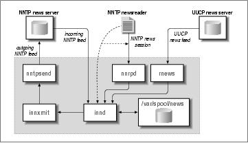 INN's core program is the innd daemon. innd 's task is to handle all incoming articles, storing them locally, and to pass them on to any outgoing newsfeeds if required. It is started at boot time and runs continually as a background process. Running as a daemon improves performance because it has to read its status files only once when starting. Depending on the volume of your news feed, certain files such as history (which contain a list of all recently processed articles) may range from a few megabytes to tens of megabytes.